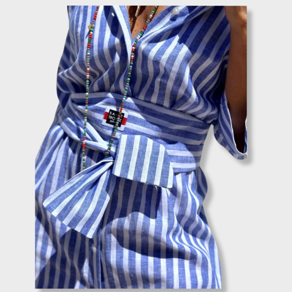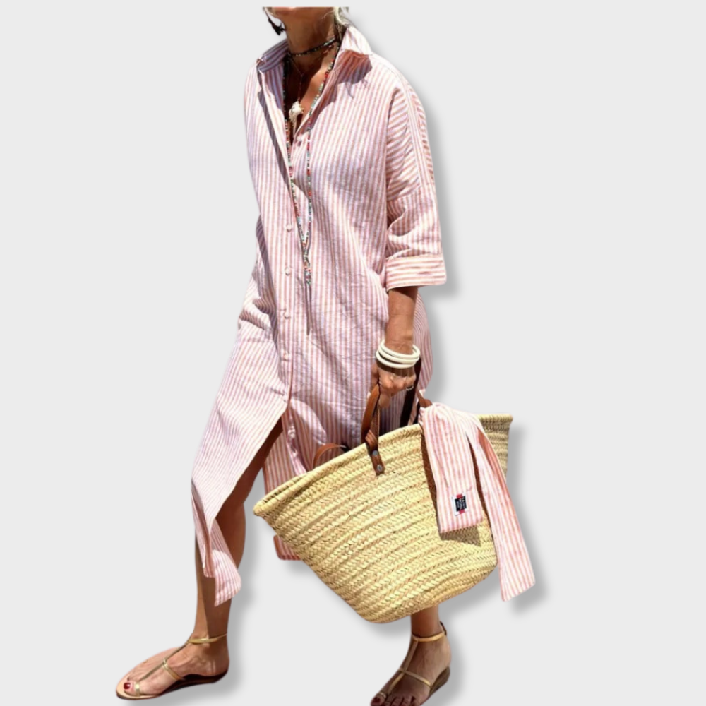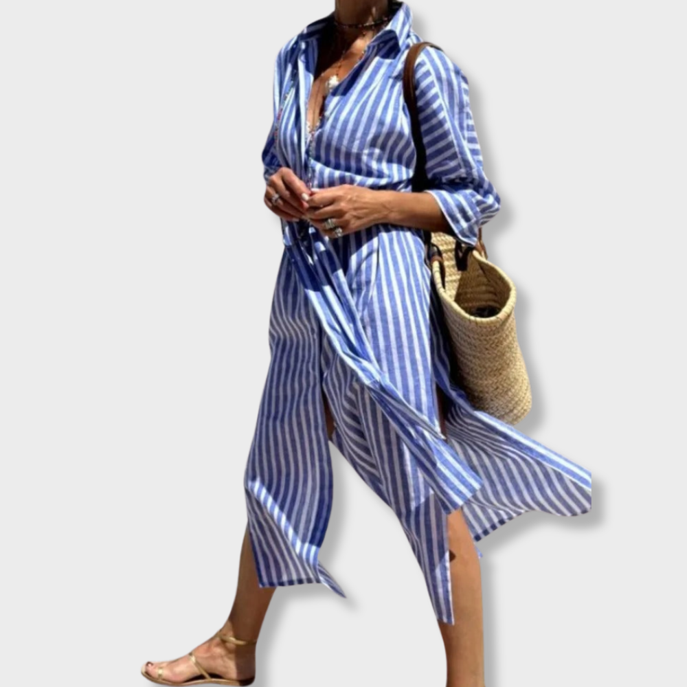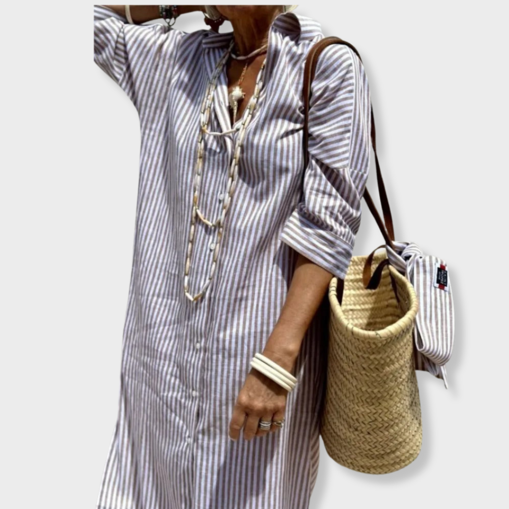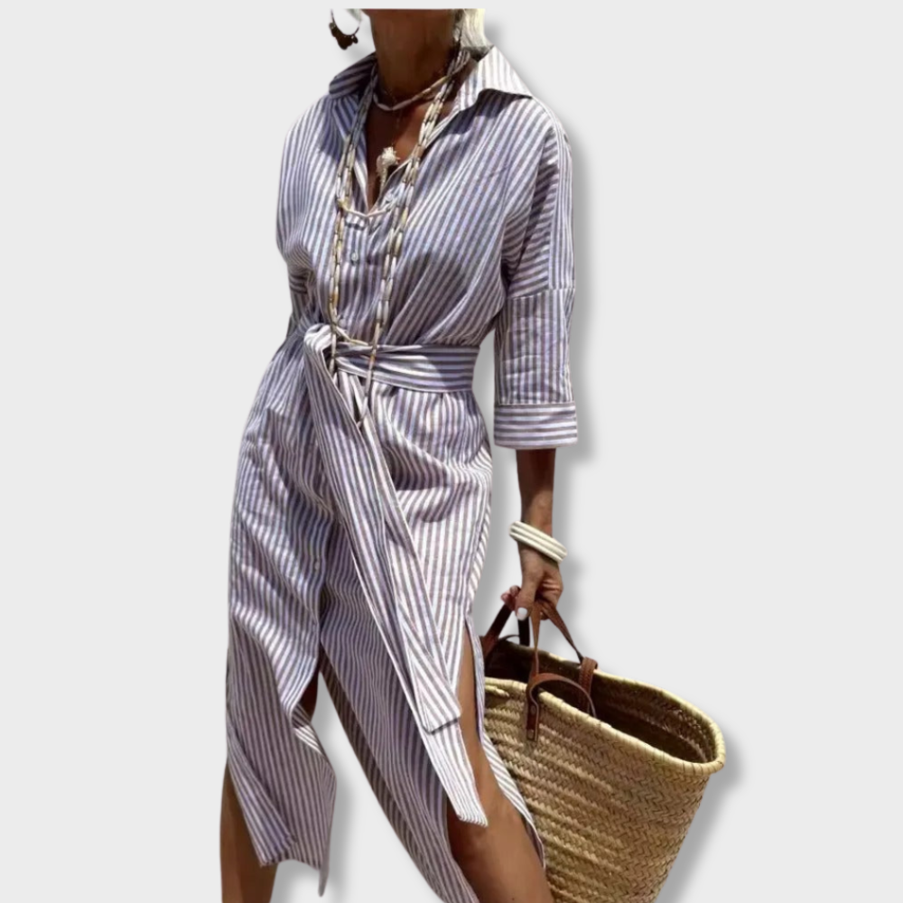 Sukienka Denise w paski z kołnierzykiem łączy ponadczasową elegancję z codziennym komfortem. Klasyczny wzór w paski i elegancki kołnierz nadają szyku, podczas gdy luźny krój zapewnia maksymalny komfort. Idealna do biura, w czasie wolnym lub na specjalną okazję!